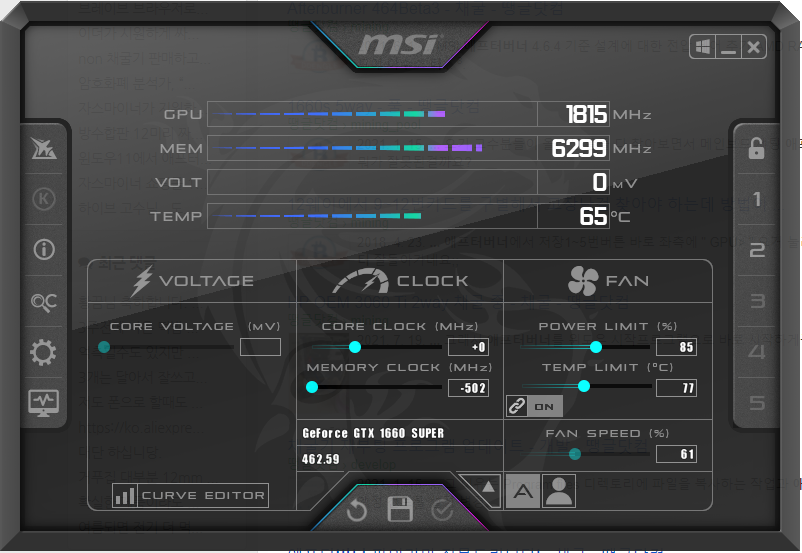 MSIafterburner.cfg 라는 파일이 있는데 이 파일을 삭제하시고 프로그램을 다시 실행하시거나,