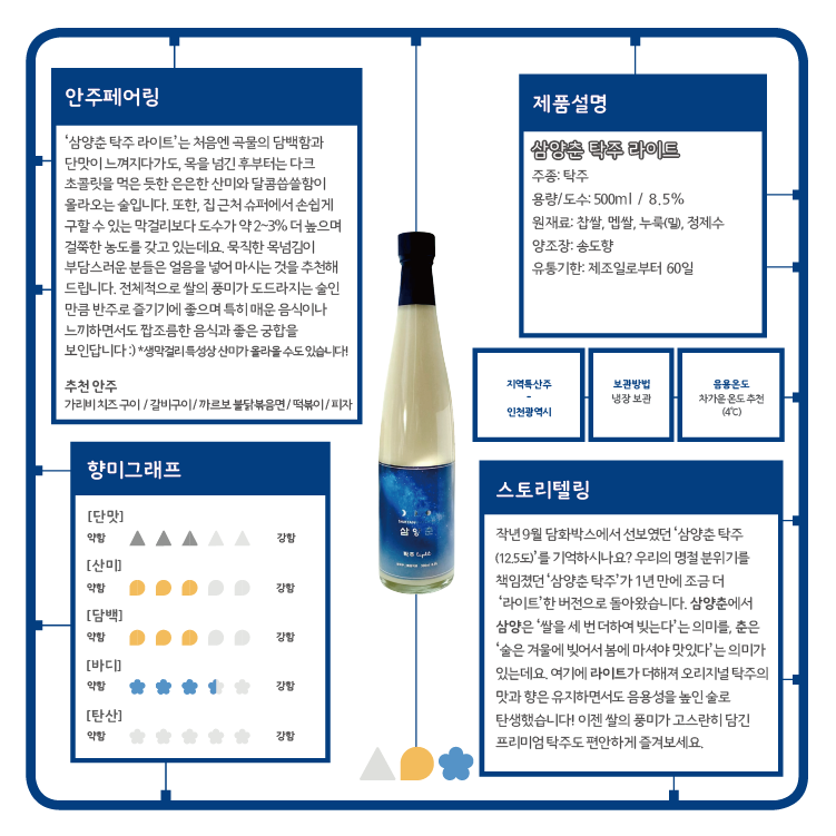 삼양춘 탁주 라이트는 쌀의 풍미가 도드라져 반주로 즐기기에 좋으며,