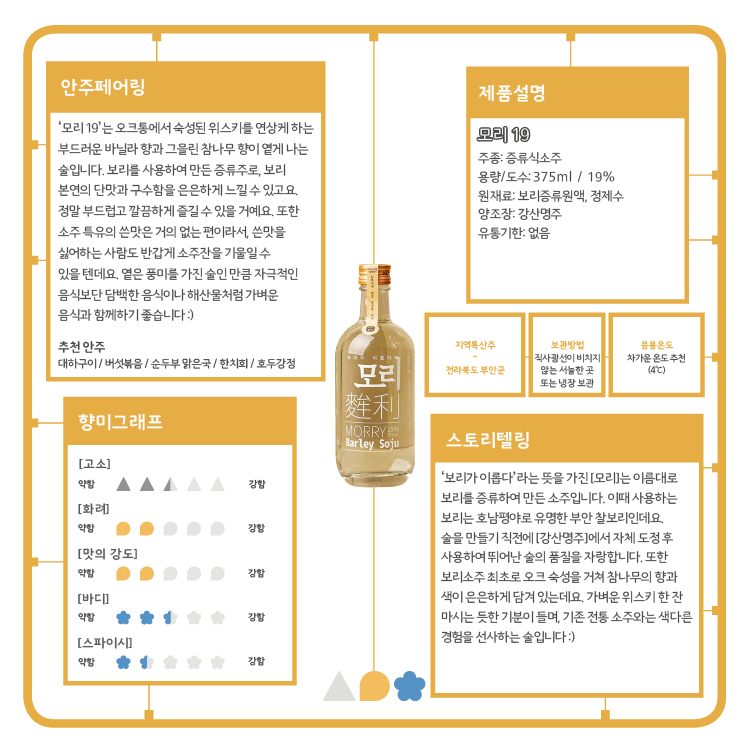 특징 : 국내산 찰보리를 사용하여 감압증류 후 오크 숙성으로 깊은 풍미를 구현한 보리 증류식 소주.